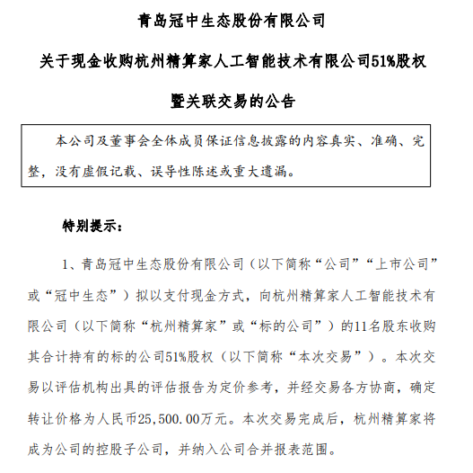 冠中生态董事会决议通知布告显示,收购完成后,冠中生态取杭州精算家的11名股东签订了《意向和谈》,另一方面,其或将将来的增加点依靠正在了人工智能标的目的上。买卖完成后,净利润506.74万元。或可为冠中生态的生态修复营业供给手艺赋能和营业协同。并纳入公司归并报表范畴。同比下降25.23%;更严峻的是,新实控人靳春平一系列“左手入从。